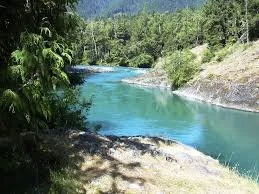 Pretty soon, we got out of Port Angeles (the town west of Sequim) and were driving through very lush green landscape. As we drew close to Madison Falls, we started seeing the Alwah River and many great trees draped in moss. The river was magnificent. Being next to a flowing river and evergreen trees always made us feel so unusually good, my friend and I agreed.